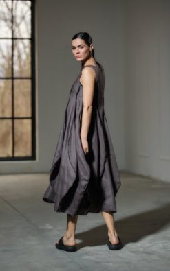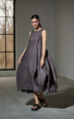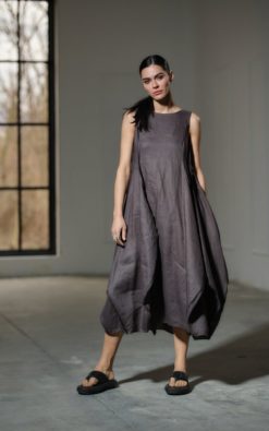 Avant-Garde Asymmetrical Linen Balloon Dress in Dark Grey – Minimalistic, Plus-Size Sustainable Fashion for Women – Boho Midi Summer Dress
