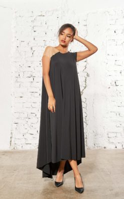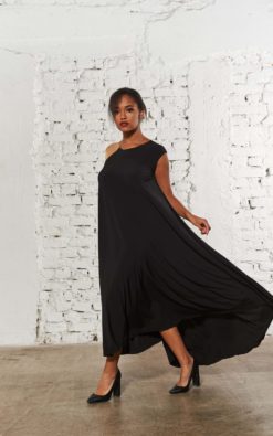 Loose dress with asymmetric shoulders designed to be worn during casual and formal occasions.