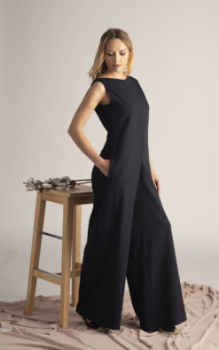 Minimalist jumpsuit featuring wide-cut leg, back zipper and side pockets. Casual elegance made easy.