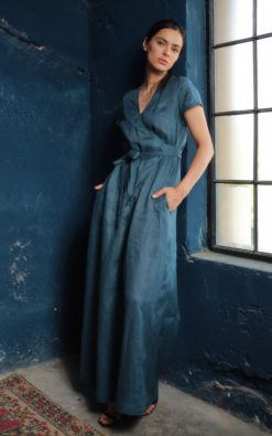 Experience the luxury of Organic Wide Leg Linen Jumpsuit. Crafted in a radiant, petroleum blue tone, this linen jumpsuit features an elegant wrap design with a coordinating belt for a refined silhouette. Perfect to enhance any capsule wardrobe, this organic wide leg jumpsuit offers a relaxed yet stylish fit that flatters every figure. Whether you’re a woman seeking plus size jumpsuit options or simply appreciate the breathable comfort of linen clothing, this overall is a perfect choice. Known for its high-quality make, our Perfect Linen range ensures durable wear and timeless style. This versatile jumpsuit transitions seamlessly from day to night and is even chic enough to be your go-to wedding jumpsuit. Embrace an aesthetic of simple sophistication with this essential piece of linen overalls for women.