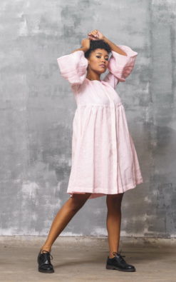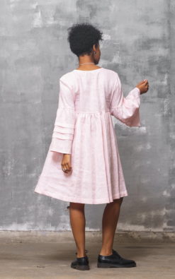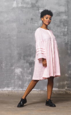 Easy to throw on, breezy linen dress, featuring an oversized relaxed fit, long sleeves with decorative pleats, a-line silhouette, crew neckline and hidden front button closure. The dress is designed to flatter every body type and fit numerous occasions.