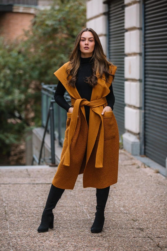 Plus Size Wool Blend Sweater Vest – Mustard Winter Hooded Vest with Big Pockets – Eco-Friendly Steampunk Style Extravagant Sweater Vest