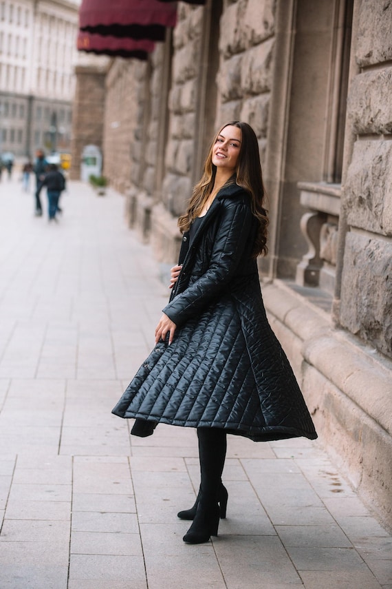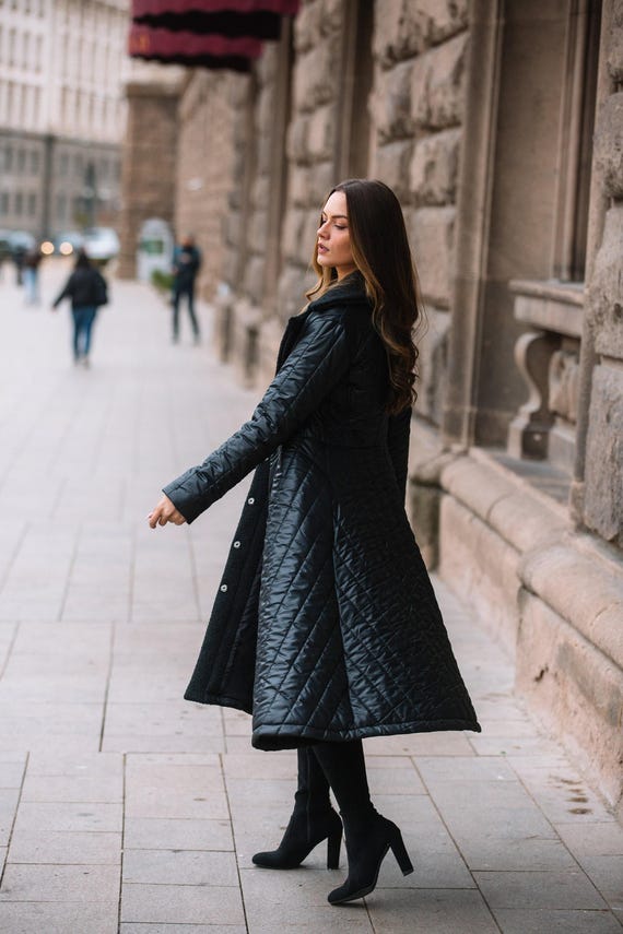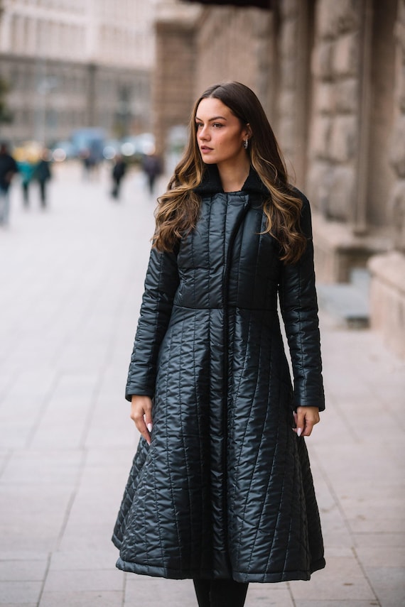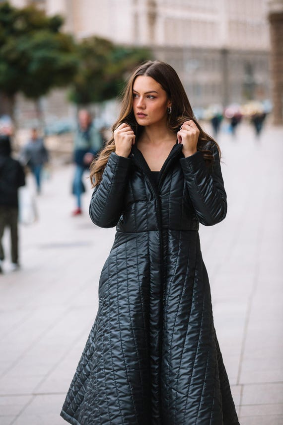 Winter Woman’s Maxi Hooded Puffer Coat in Black – Casual Quilted Jacket with Lapel Collar for Warmth & Style – Long, Stylish Cyberpunk & Steampunk Inspired Design